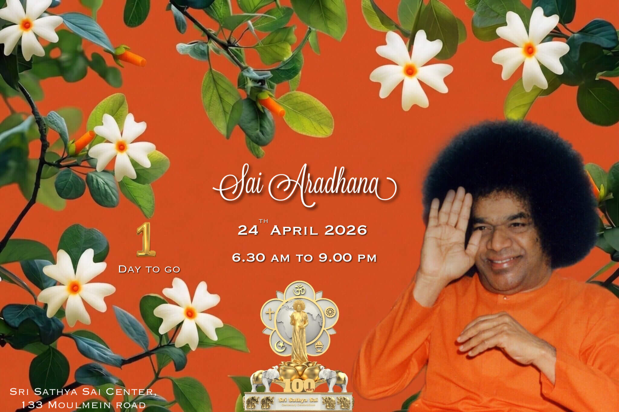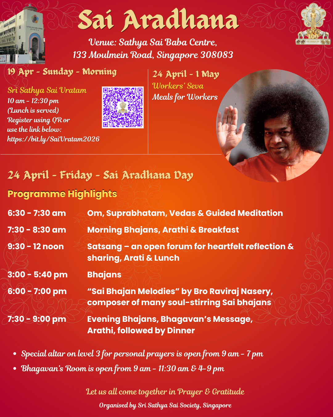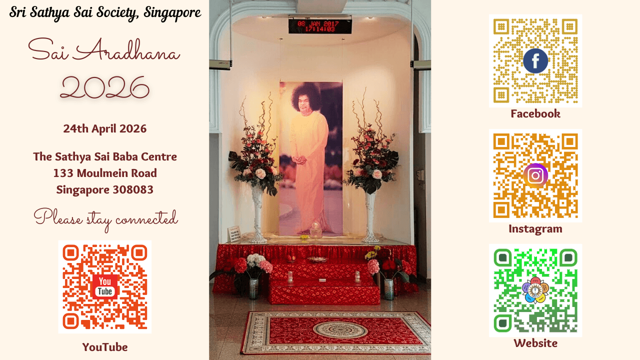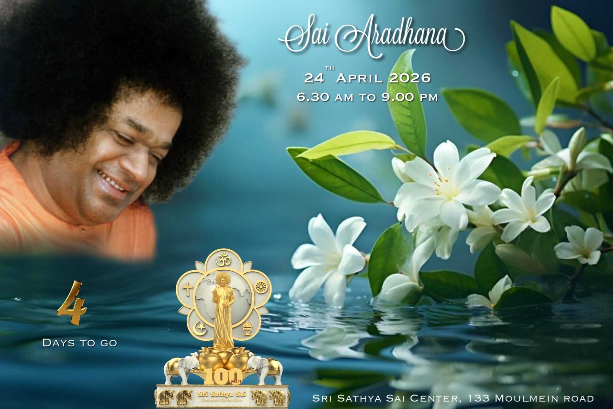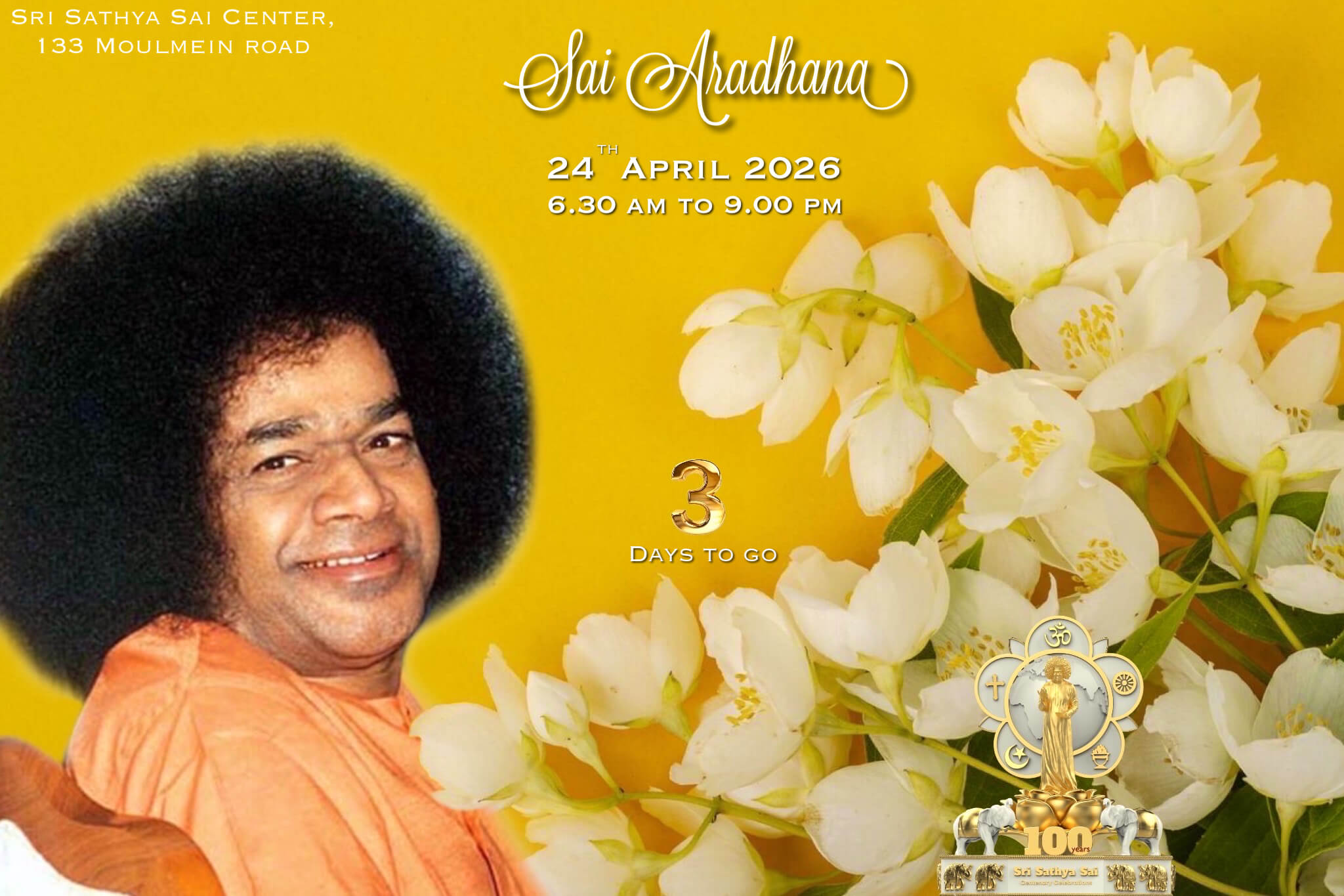 Sai Aradhana will be commemorated on Friday, 24 April 2026 at the Sathya Sai Baba Centre, 133 Moulmein Road.