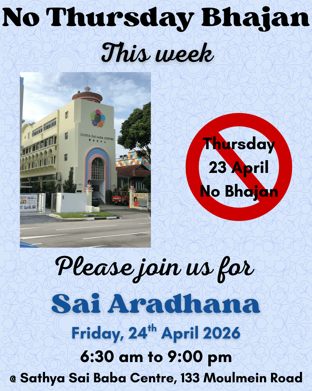 Sairam. Tomorrow is the much-awaited Sai Aradhana! Come and join us at Bhagawanโs Temple in Singapore for a morning and evening programme onย 24thย April (Friday) from 6:30 am to 9:00 pm. Venue: Sathya Sai Baba Centre, 133 Moulmein Road, Singapore 308083. Do visit Bhagawanโs room on level 4, spend time at the special altar on level 3, and in the prayer halls on levels 1 and 2. Please note that Bhagawanโs Room is open for darshan from 9 am to 11:30 am in the morning and from 4 pm to 9 pm in the evening. The special altar is open from 9 am to 7 pm. Breakfast, Lunch and Dinner prasadam are served. Join us for the special evening programme that includes a special programme โSai Melodiesโ, followed by evening bhajans, and Arathi. See the Sai Aradhana poster for details. If you have missed our earlier post, please see here:ย https://saisociety.org.sg/2026/04/sai-aradhana-2026/.