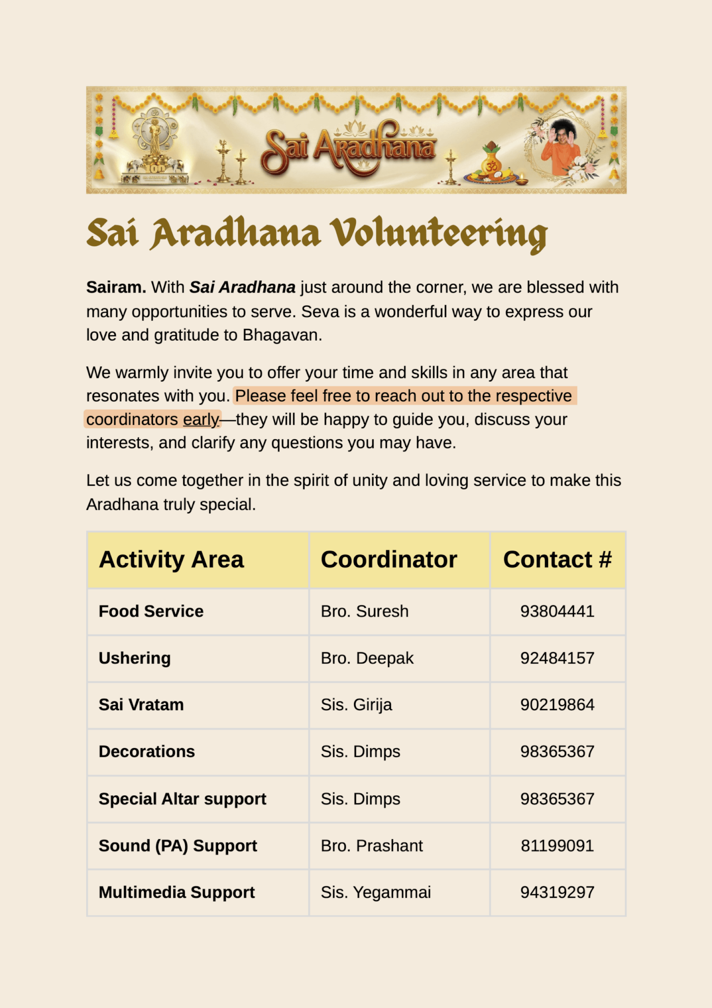 We warmly encourage you to come forward and contribute your time and skills in any area that resonates with you. Please reach out directly to the respective coordinator listed in the flyer. They will be happy to guide you, answer your questions, and include you in their team roster.