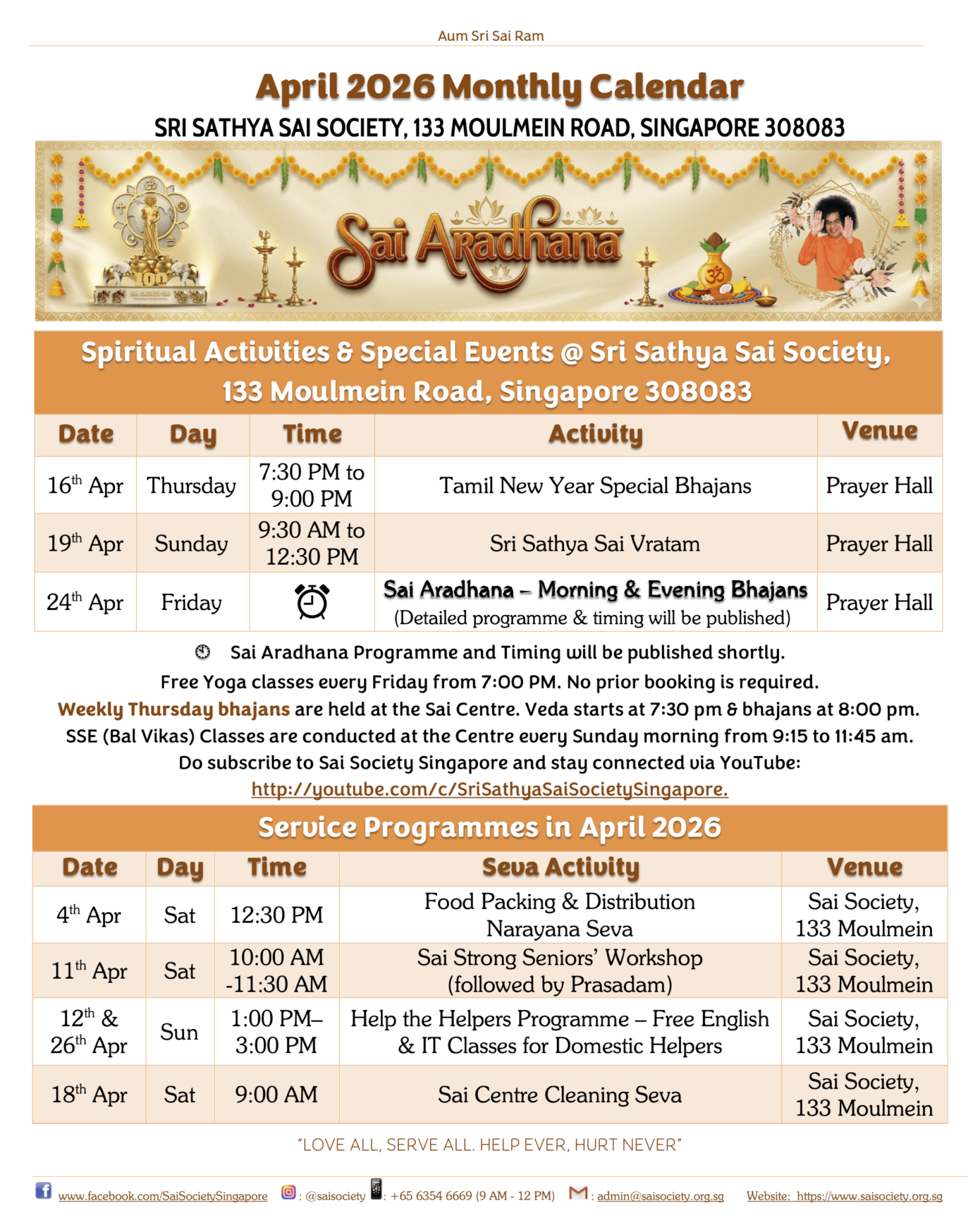 Highlights of April include Sai Aradhana, Sri Sathya Sai Vratam and Tamil New Year special bhajans. A separate Sai Aradhana announcement will give the detailed programme on 24th April 2026.