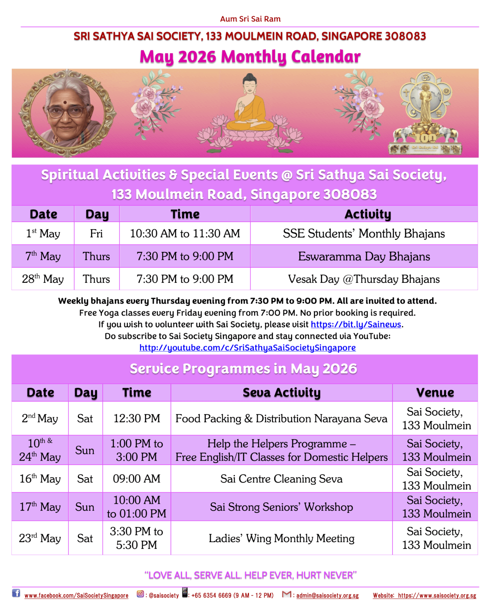 Sairam. We are happy to invite you to Bhagawan’s Weekly Thursday bhajans. The bhajans are held in level 1 prayer hall, with level 2 hall serving as an extension. No registration is needed to attend the bhajans. Open to all devotees. Please do not attend if you or a member of your household is unwell. The Bhajans/Veda are from 7:30 pm to 9 pm on Thursday evenings. The venue is Sathya Sai Baba Centre, 133 Moulmein Road, Singapore 308083. Please see details in the flyer. Please join us for the weekly Thursday bhajans.