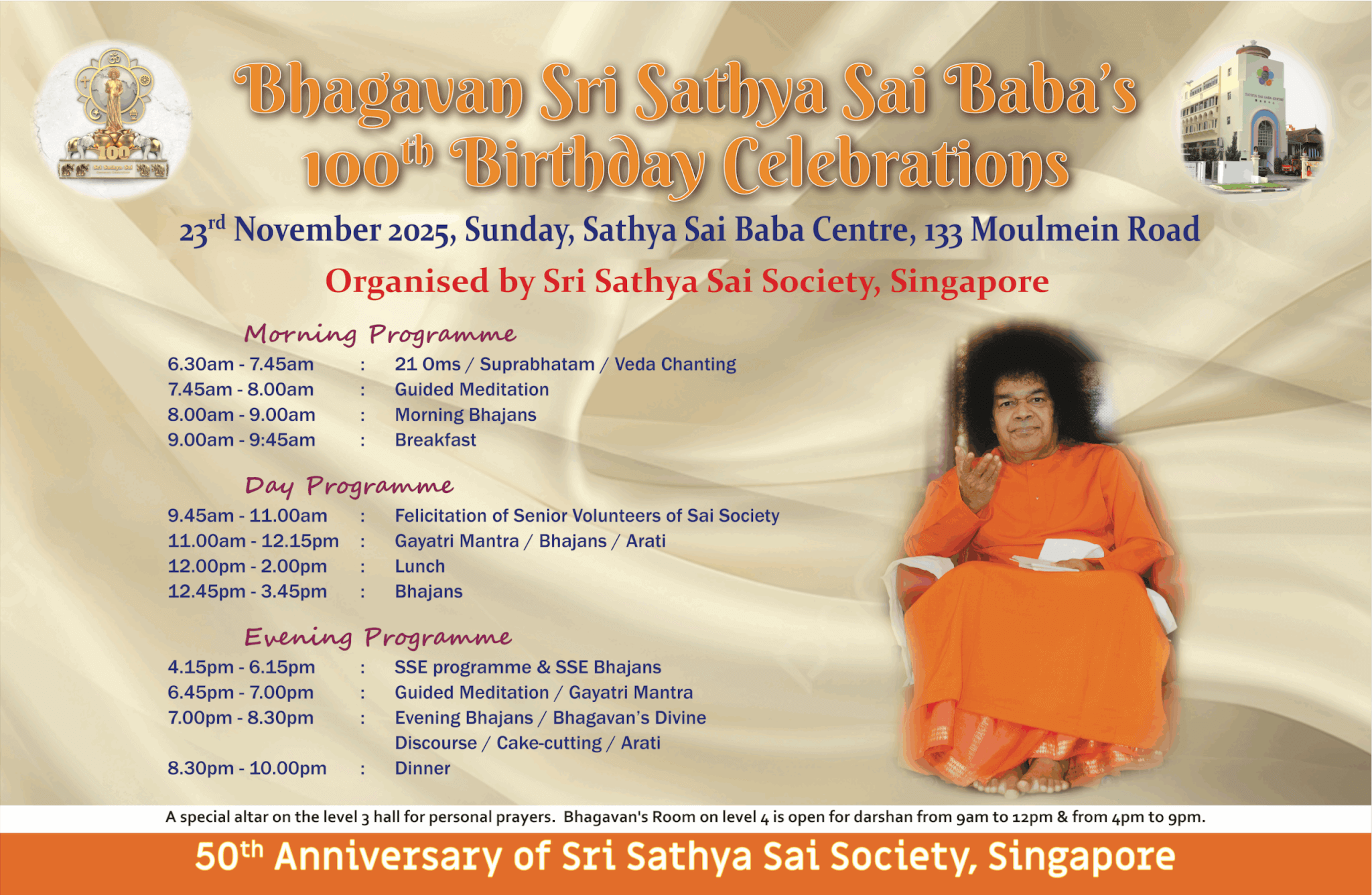 The countdown is on! Bhagavan Sri Sathya Sai Baba’s 100th Birthday Celebration is almost here, and the Sathya Sai Baba Centre of Singapore is joyfully preparing to welcome you.